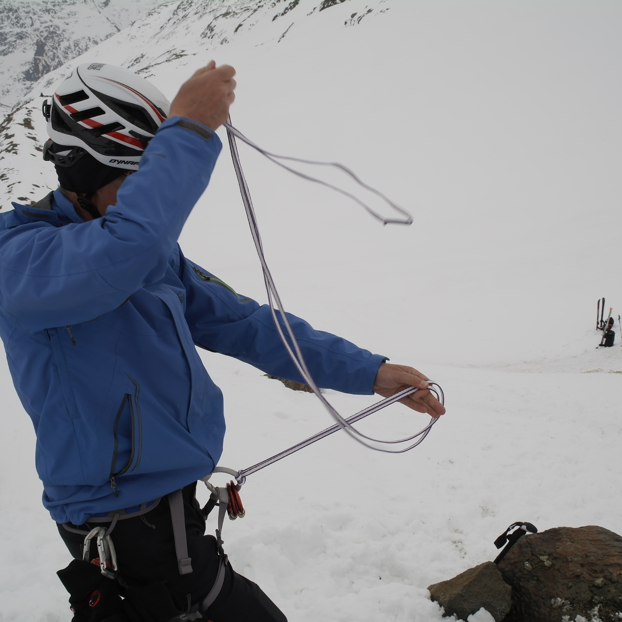| Verhalten auf Skitouren im vergletscherten Gelände, Handhabung von Seil, Pickel und Steigeisen, Spaltenbergung und Überwindung kurzer felsiger oder eisiger Passagen und vieles mehr wurde während des Kurses geübt. | |