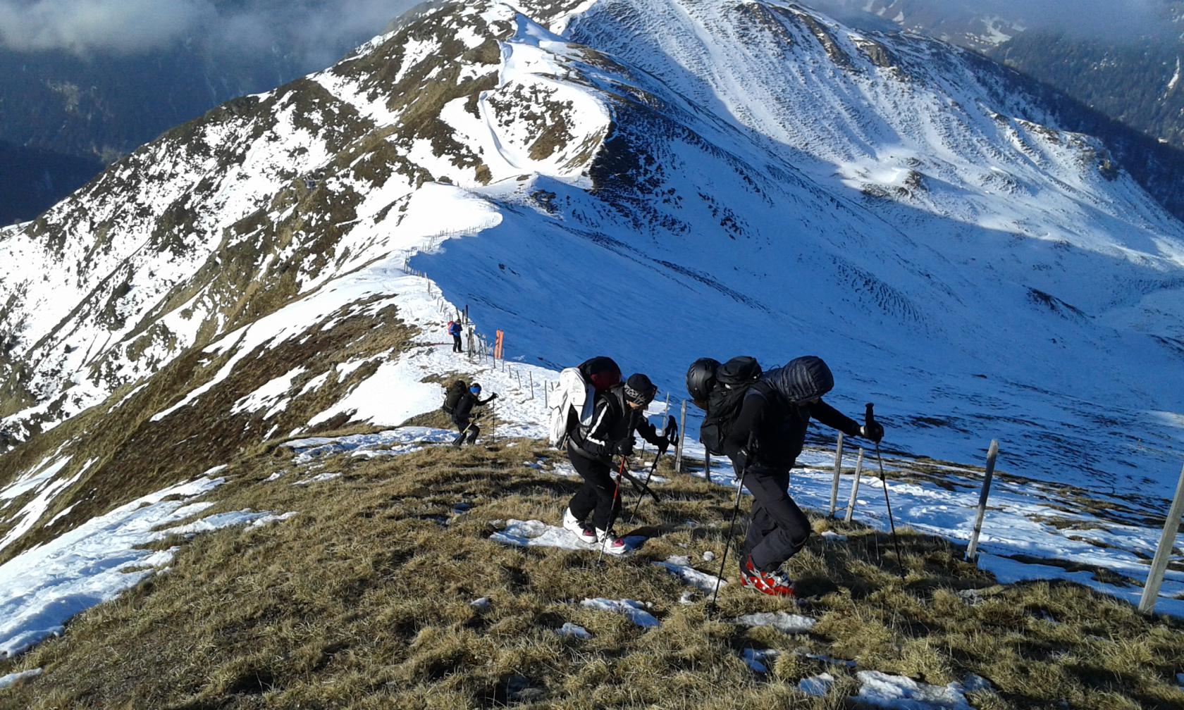 ![]() Bei überlegter, der Lawinengefahr angepasster, Routenwahl ist die Vennspitze eine ziemlich sichere Tour. Niemand kann sich aber an derart wenig Schnee erinnern. Im Aufstieg stellte das noch kein Problem dar. Der erste Teil der Abfahrt war ebenfalls noch halbwegs machbar. Bald wurde daraus aber ein wilder Slalom zwischen Almrosenstauden. Und damit es nur ja nicht langweilig wurde gab’s dort, wo die Almrosen-Torstangen fehlten, besonders heimtückischen Windharsch. Wir teilten also unsere Abfahrt in viele 100-m-Abschnitte. Sogar einer unserer wildesten Draufgänger wurde bei diesen Bedingungen ganz langsam und vorsichtig. Begleiter auf dieser Tour war überdies ein, nicht gerade angenehmer, Wind. |