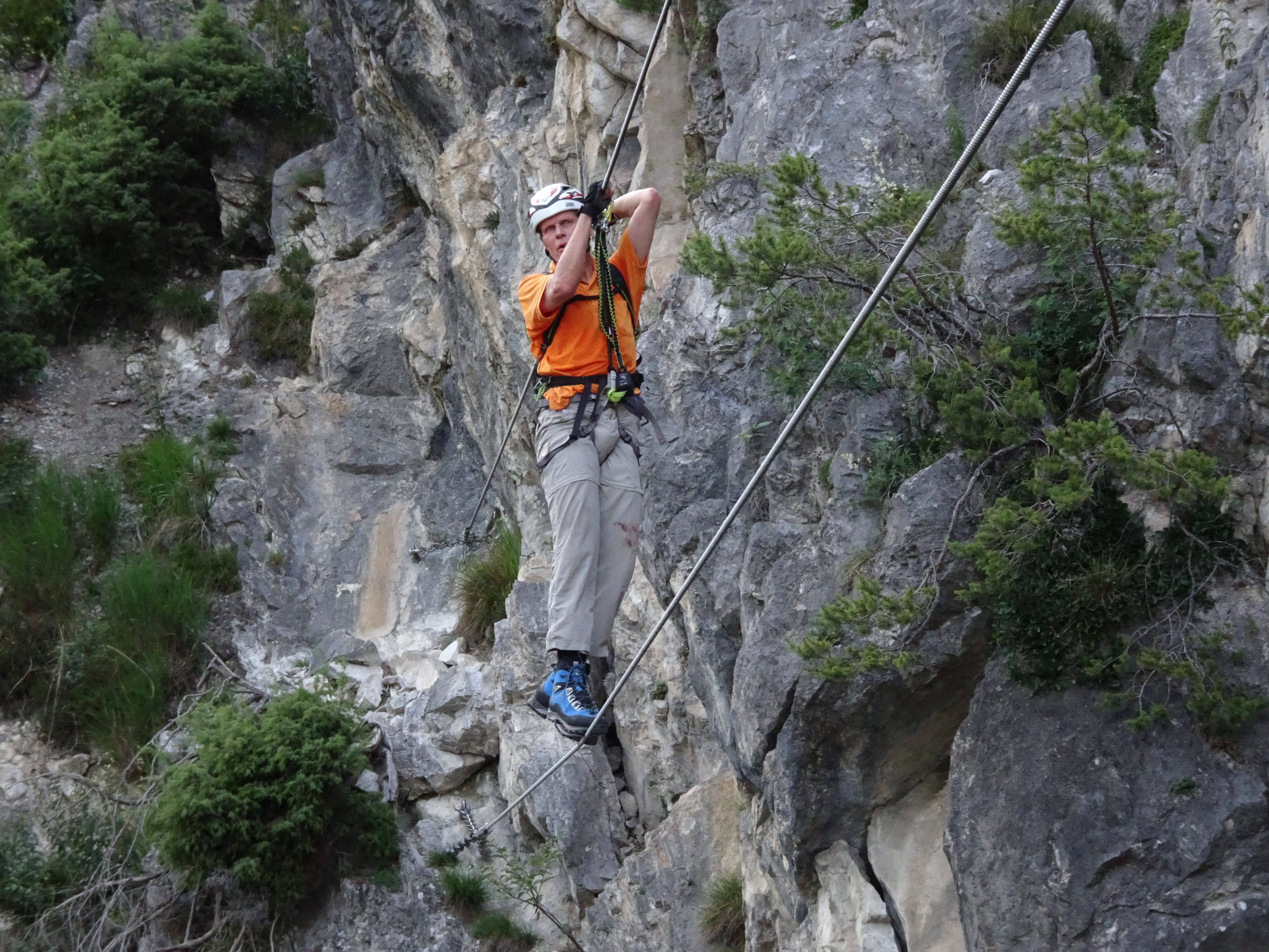 Die Temperatur deutete ja eher auf Schwimmbadbesuch hin, trotzdem wollte Peter endlich einmal erste Klettersteigversuche in Angriff nehmen. So machten wir uns auf den Weg zum „Crazy-Eddy“. Der Zustieg verläuft durch schattigen Wald und war so trotz der Hitze recht erträglich. Die Schwierigkeiten sind eher moderat, die abschließende Hängebrücke bietet letztlich aber doch noch ein spannendes Finale. |