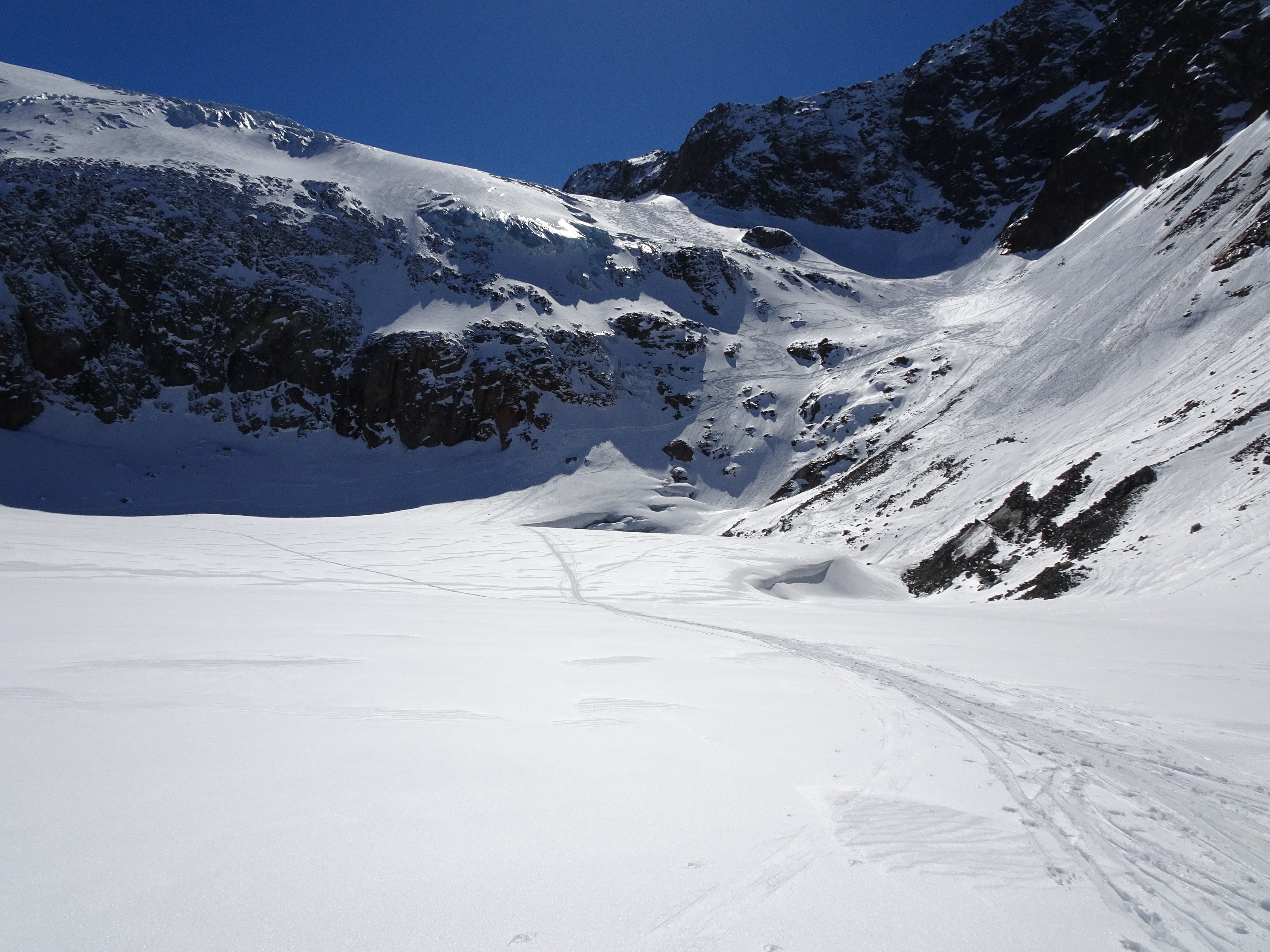 | Es ist kaum vorstellbar, welch Menschenmasse sich auf den Weg zum Zuckerhütl machte. Der Entschluss diesen Gipfel erst gar nicht zu besteigen war daher sehr schnell gefasst. Den Wilden Pfaff hingegen mussten wir nur mit einigen wenigen Tourengehern teilen. Als wir dann den Abstieg in Augenschein nahmen wurden unsere Gesichter immer länger. Schweren Herzens entschlossen wir uns zur Sulzenauerhütte abzufahren. Bereut haben wir die Entscheidung letztlich aber doch nicht, bescherte uns die Abfahrt doch viele Höhenmeter wunderbarsten Pulverschnee, wohlgemerkt am 8. April. Da störte es auch nicht, dass wir ab der Sulzenauerhütte die Ski größtenteils tragen mussten. | |
