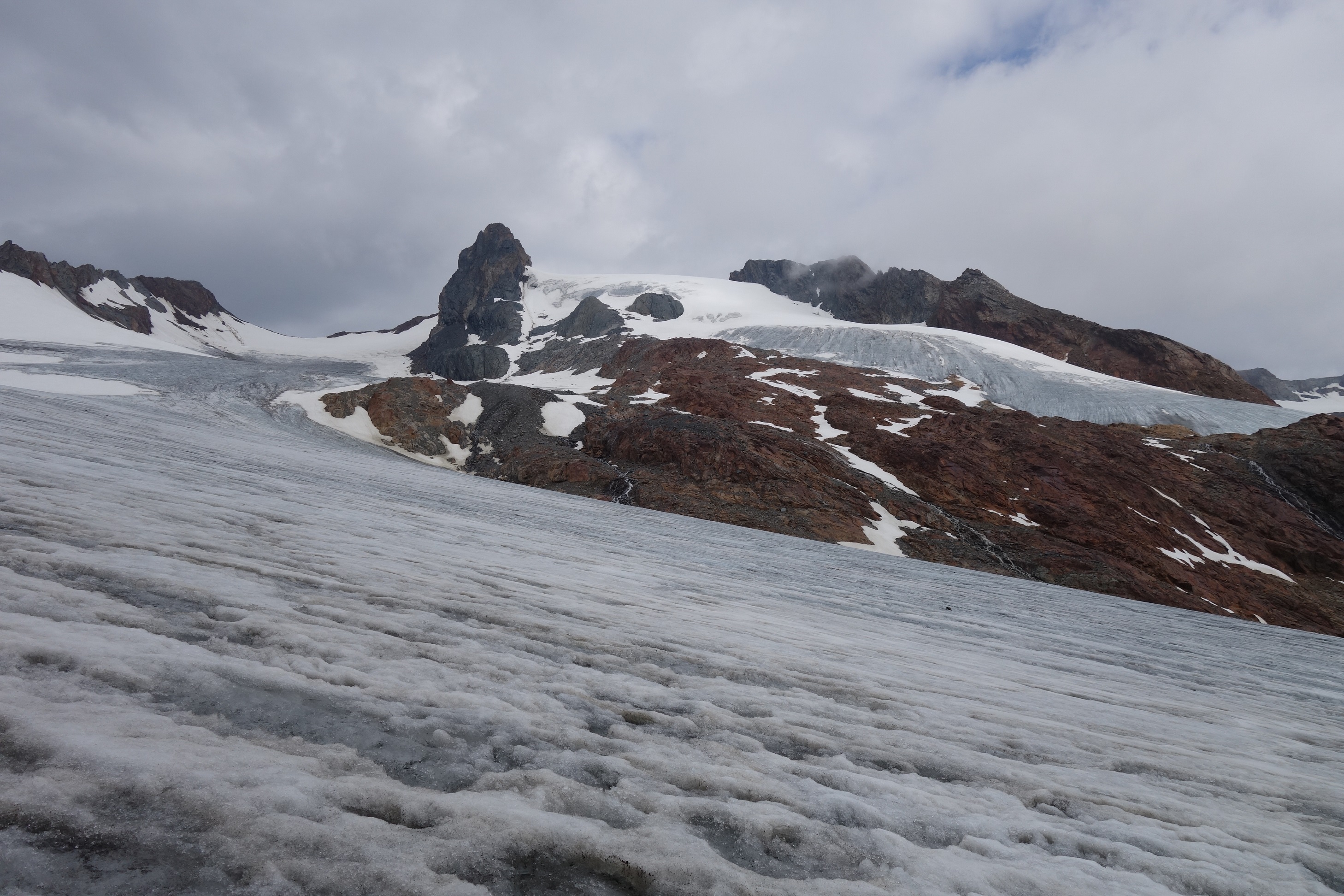 Tourenziel des heutigen Tages war die Schwarzwandspitze (3.466 m). Im Zuge des Aufstieges wurde das Gehen mit Steigeisen und die Bildung und das Verhalten von Gletscherseilschaften geübt. Leider endete die Tour, wegen der schlechten Verhältnisse, ca. 150 m unterhalb des Gipfels auf einem aussichtsreichen, überfirnten Joch. Der weitere Anstieg zum Gipfel war steil, äußerst brüchig und bot kaum brauchbare Sicherungsmöglichkeiten. Während des Abstieges bauten wir noch mit Hilfe von Eisschrauben Verankerungen im Eis und mit Hilfe eines T-Ankers im Firn.