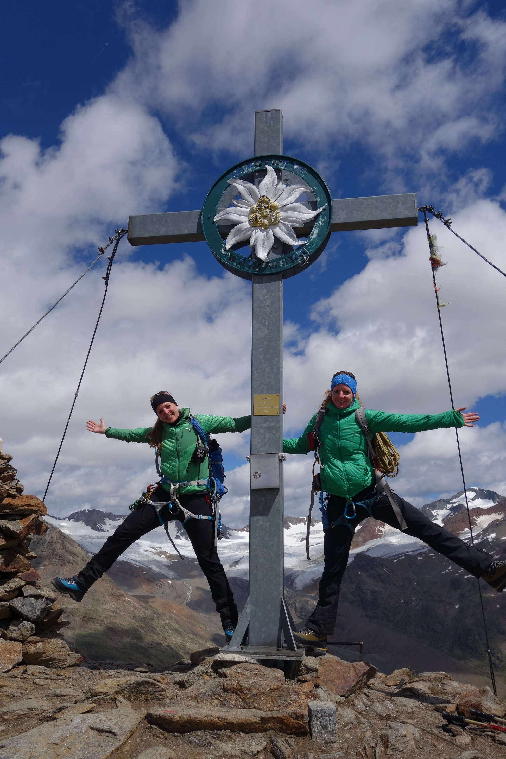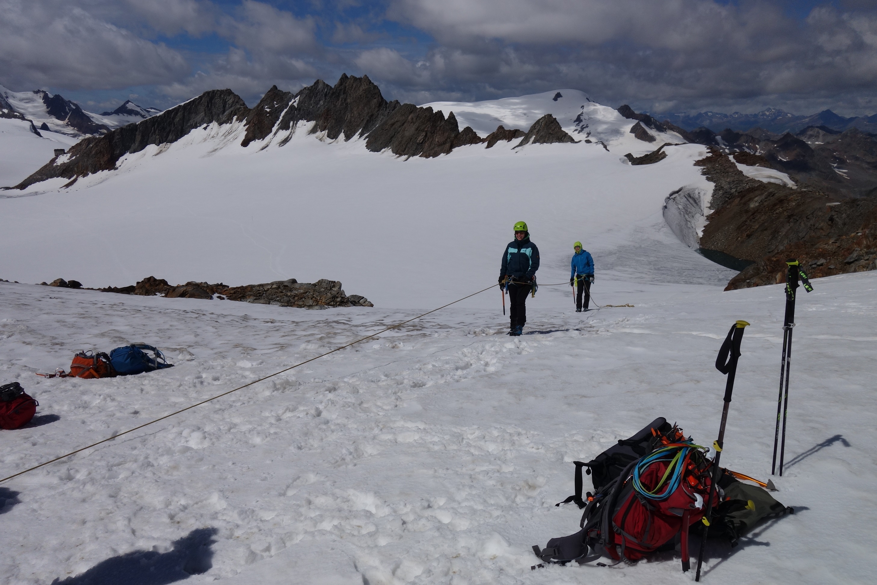 Die heutige kurze Tour auf die Mittlere (3.128 m) und Hintere Guslarspitze (3.147 m) stand ganz im Zeichen der Orientierung. Der Anstieg zu den Gipfeln war eine hübsche Wanderung ohne Gletscherbegehung, bot aber immer wieder interessante Möglichkeiten das Gelände mit der Karte zu vergleichen und grobe Berechnungen über die noch zurückzulegende Wegstrecke und die Gehzeit anzustellen. In den Nachmittagsstunden wurde, wieder im Nahebereich der Hütte das aktive, gesicherte Abseilen und die Selbstrettung aus einer Gletscherspalte mit Hilfe der „Münchhausentechnik“ erlernt. Abends beschäftigten wir uns mit Tourenplanung.