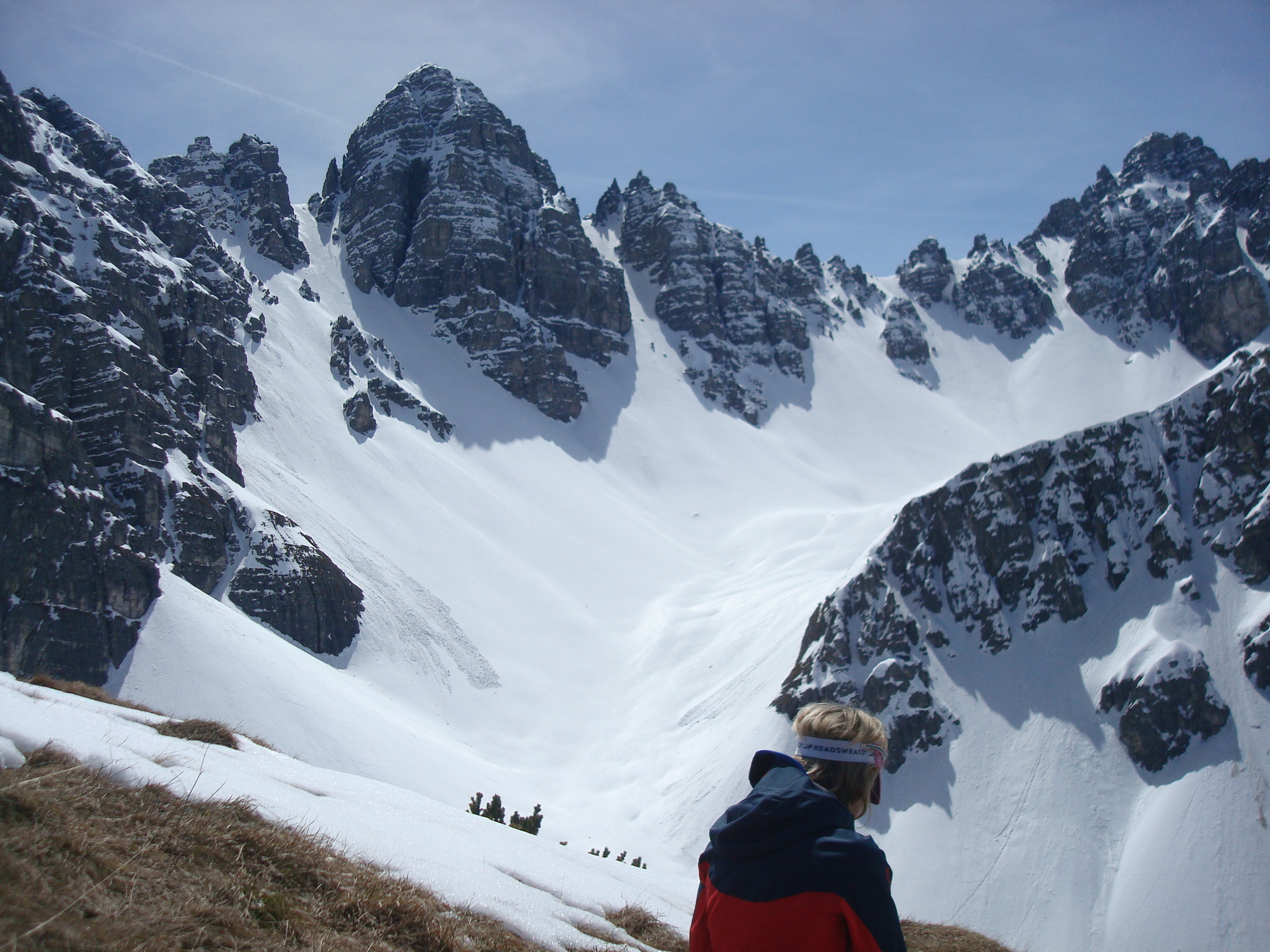 Nach der ersten Abfahrt über ca. 750 Höhenmeter und einer kurzen Rast folgte der Wiederanstieg von der Isse über das Halsl auf die Schneiderspitze. Durch die bereits sehr intensive Sonneneinstrahlung wurde das zu einer sehr scheißtreibenden Angelegenheit. Doch auch diese Mühen lohnten sich, da die anschließende Abfahrt wiederum mit bestem Firn belohnt wurde. (PeSa)